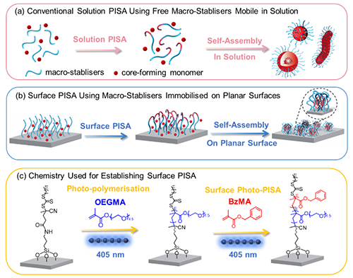 圖1:a) 使用自由大分子引發(fā)劑的常規(guī)溶液 PISA,b) 由錨定在平面上的大分子引發(fā)劑介導的表面 PISA,以及 c) 本研究中用于建立表面 PISA 的化學方法。