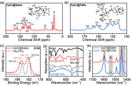 圖2.(a)CpZr@Salen 和(b)CpZr@TzDa 的 13C CP/MAS 核磁共振譜圖;(c)Cp2ZrCl2 和CpZr@Salen 中 Zr(3d3/2) 和 Zr(3d5/2) 的結合能;(d)COF-Salen、COF-TzDa、CpZr@Salen 和 CpZr@TzDa 的傅里葉變換紅外光譜;(e)CpZr@Salen 和 CpZr@TzDa 的吡啶紅外光譜。