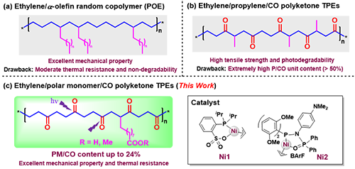 大連理工大學的劉野教授長期致力于脂肪族聚酮這一高性能工程塑料的合成研究。此類材料主鏈中的羰基不僅賦予其優異的力學性能和耐熱性(熔點可達260 °C),同時也作為光敏基團,可在特定光照條件下發生斷鏈反應,實現材料的降解。利用乙烯/CO交替聚酮的高強度和耐高溫的特點,開發聚酮基彈性體是一種實現高性能與可降解性統一的重要策略。然而,將高度結晶的聚酮塑料轉化為彈性體面臨兩大難題: