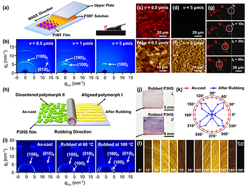 圖3. (a-g)通過二維空間限域結晶策略調控聚(3-丁基噻吩)晶型II到I的轉變;(h-l)通過機械摩擦調控聚(3-己基硒吩)晶型II到I的轉變。