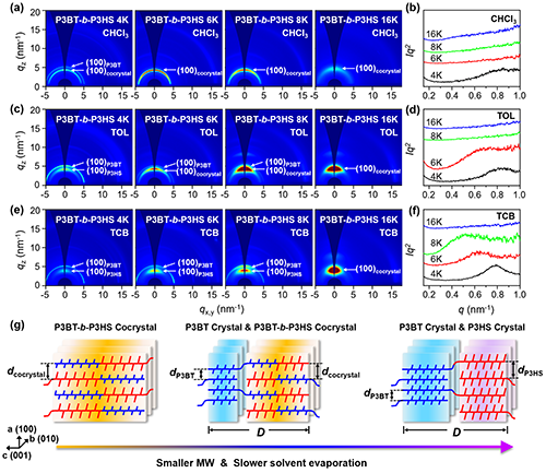圖5. (a-g)不同分子量的P3BT-b-P3HS經三種溶劑成膜后的GIWAXS結果、 SAXS結果以及P3BT-b-P3HS形成共晶和微相分離結構的示意圖。