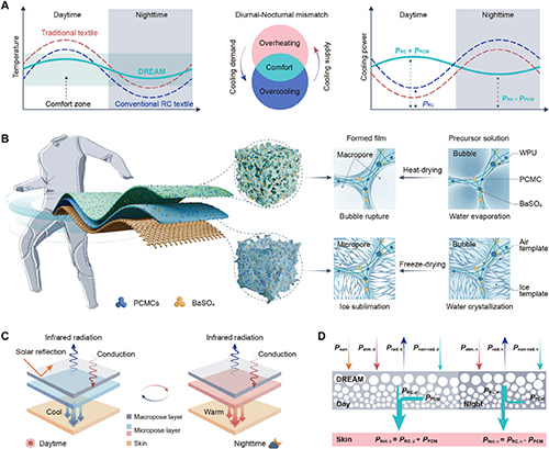 DREAM采用空氣/冰雙模板法構建梯度孔隙結構:微觀孔層(平均孔徑6.1μm)與宏觀孔層(平均孔徑71.3μm)形成熱導率差異,誘導熱流定向傳導,從而在高溫環境下有效抑制對流熱輸入。相較于傳統紡織品與普通RC織物,DREAM在動態環境中表現出顯著的自適應優勢,其日夜循環的能量管理機制可顯著提升熱舒適性。