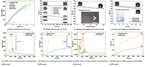 通過(guò)與僅阻燃浸漬、未做熱壓與疏水涂覆的R-wood,以及“阻燃浸漬+機(jī)械熱壓”、未做疏水涂覆的RD-wood對(duì)比,完整工藝處理的RDS-wood在核心性能上都展現(xiàn)出了顯著優(yōu)勢(shì)。