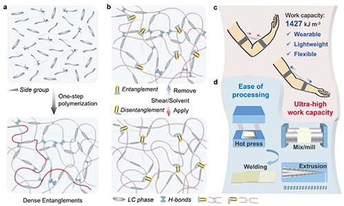 上海交通大學的劉湍和林秋寧等人通過一步無溶劑、無催化劑聚合反應,成功合成了帶有甲基側基的高分子量線性LCE(LLCE-0.5-1)。該結構有助于形成高密度的分子鏈纏結(圖1)。鏈纏結作為物理交聯,顯著提升了LCE的力學性能,并使其達到創紀錄的驅動做功性能(1,427 kJ m-3)。此外,鏈纏結的可逆性賦予材料類似熱塑性塑料的易加工特性,可以通過熱壓、開煉和熔融擠出等工藝實現材料加工。基于這些優勢,作者成功制備了僅重8.7 g的可穿戴驅動器件,能夠可逆地提起成年男性的前臂,展現出卓越的做功能力。