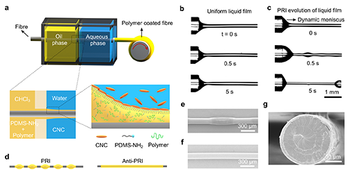 該研究工作采用一種纖維的流體涂覆技術,首先拉伸纖維至含氯仿、聚合物配體(PDMS-NH2)和涂層聚合物(PMMA、PS等)的油相,隨后拉伸涂覆有油膜的纖維進入水相(CNC-OSO3H的水分散液),該過程中PDMS-NH2與CNC-OSO3H在油/水兩相界面處的靜電相互作用,利用二者在油膜表面快速的共組裝以及形成納米粒子—聚合物組裝體的堵塞(jamming)以抑制該油膜的Plateau–Rayleigh不穩定性,從而在纖維表面制備均勻液膜及聚合物涂層。