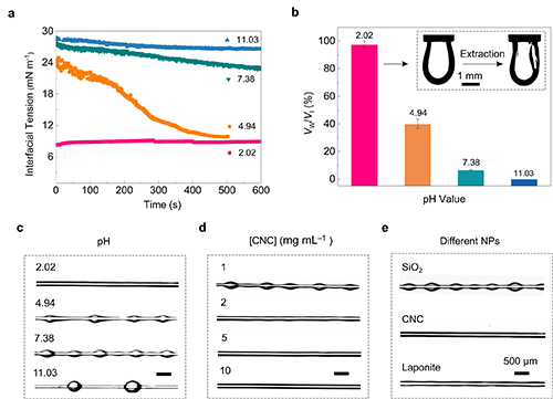 由于纖維表面的油膜演變為不均勻液膜(紡錘結構液膜)僅需0.5 s,因此界面組裝形成的PDMS-NH2/CNC-OSO3H組裝體能否抑制油膜的Plateau–Rayleigh不穩定,主要取決于兩者共組裝動力學,即組裝至兩相界面并形成阻塞狀態的時間尺度。二者的共組裝動力學受多個參數影響:包括可調控靜電相互作用的pH值(取決于PDMS-NH2和CNC-OSO3H的pKa值),決定擴散速率的聚合物和顆粒尺寸,以及影響擴散至界面平均距離的濃度。基于此,作者研究了水相pH、CNC濃度、納米粒子種類、聚合物鏈結構和濃度對二者界面組裝動力學的影響,并通過纖維在流體涂覆過程中觀察各條件下液膜Plateau–Rayleigh不穩定的抑制情況。研究發現在0.5 s內,二者界面組裝體密度≥75%可抑制纖維表面液膜的Plateau–Rayleigh不穩定,在纖維表面得到均勻液膜。
