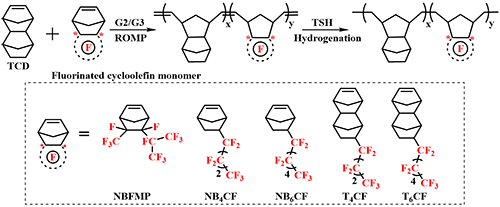 天津大學潘莉教授團隊在環烯烴單體的開發、環烯烴共聚物/聚合物(COC/COP)的設計合成與功能化方面深耕多年,積累了豐富的經驗及眾多研究成果(Chem. Eng. J. 2024, 494, 153256;Chin. J. Chem. 2025, 43(9), 983-994; Macromolecules 2023, 56(11), 4371-4385;Mat. Chem. Front. 2019, 3(3): 464-471)。本研究中,團隊進一步突破單體設計與聚合工藝瓶頸,以降冰片烯、四環十二碳烯衍生物為骨架,設計合成了系列氟代環烯烴單體,并通過ROMP聚合基后續氫化工藝,在單一體系實現了F-COPs氟含量可調、光學等物理性能的協同優化。