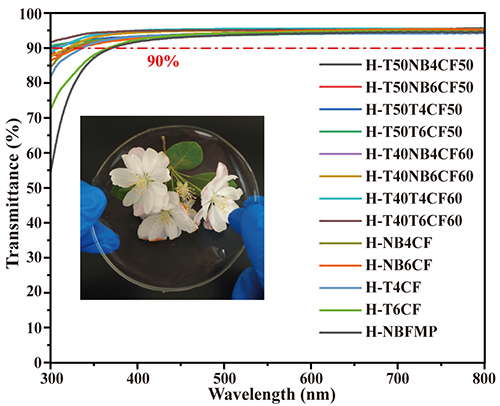 光學領域應用探索:盡管傳統聚四氟乙烯(PTFE)和聚偏氟乙烯(PVDF)具有高氟含量,但其顯著的結晶性卻嚴重制約了它們在高透明度光學材料中的應用。得益于環氟結構的設計,材料的無定形的特性為該新型含氟環烯烴聚合物在光學材料的應用提供了重要結構基礎。最終實現材料光學性能的定制調控:可見光區透光率> 90%,折射率(589 nm)實現1.4771~1.3939的連續可調,反射率< 2%,阿貝數> 60,有效滿足抗反射等光學涂層應用的需求(圖2;圖3;圖4);