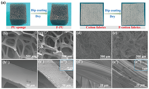 超疏水性能與油水高效分離應用探索:憑借含氟材料固有的低界面能的特性,F-COPs 的另一突破性應用是作為超疏水功能涂層。傳統實現超疏水復合材料的構筑往往是借助低表面能材料結合納米粒子提供的多級微納粗糙結構,在本工作中通過一步浸涂工藝(含氟聚合物溶液)修飾商用聚氨酯(PU)海綿與棉織物,經浸漬處理后海綿和棉織物表面自發形成多級微納粗糙結構,最終實現超疏水、高效油水分離材料的構筑。