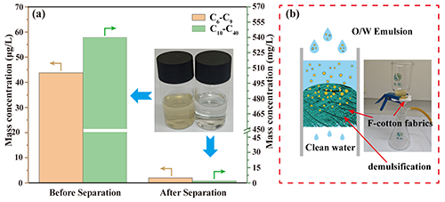 相較于傳統的非混相油水混合物的分離,具有更小尺寸的油水乳液的分離一直是工業界的一個難點。在本工作中通過以F-cotton fibrics自制的多層疊加過濾層對實際油田生產廢水中的油水乳液進行分離處理,經處理后的C10-C40 烴類去除率達99.6%,濾液油含量低于國家排放標準(< 15 mg/L)。簡單便捷的浸漬處理工藝為該復合材料的實際工業應用提供了巨大潛力。