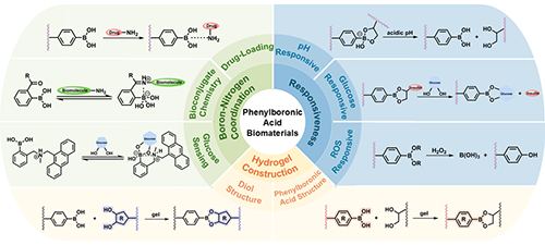 隨著生物醫(yī)學(xué)工程的快速發(fā)展,具有環(huán)境響應(yīng)性與功能特異性的先進(jìn)生物材料,在精準(zhǔn)醫(yī)療、組織再生和疾病診斷等領(lǐng)域展現(xiàn)出巨大潛力。苯硼酸(PBA)及其衍生物作為一類結(jié)構(gòu)獨(dú)特、功能多樣的有機(jī)硼化合物,受到廣泛關(guān)注。PBA分子不僅具有路易斯酸性,可與含氮基團(tuán)形成配位鍵,用于藥物控釋、生物偶聯(lián)和生物傳感;還能與順式二醇可逆結(jié)合形成硼酸酯鍵,實(shí)現(xiàn)對(duì)pH、葡萄糖、活性氧(ROS)等關(guān)鍵生理信號(hào)的響應(yīng)。基于這些機(jī)制,研究人員已開(kāi)發(fā)出多種智能生物材料,如苯硼酸酯水凝膠,可通過(guò)動(dòng)態(tài)交聯(lián)網(wǎng)絡(luò)實(shí)現(xiàn)性能精準(zhǔn)調(diào)控。盡管已有多篇綜述從應(yīng)用角度總結(jié)PBA材料,但仍缺乏系統(tǒng)性框架將基礎(chǔ)的化學(xué)原理轉(zhuǎn)化為普適性的材料設(shè)計(jì)策略。