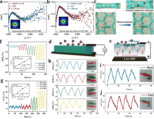 天然植物的葉子表現出非凡的感知水分和利用環境能量的能力。由于這種生物啟發葉脈隔離網絡結構,彈性體表現出優異的水分響應性能。加入CMCS后,彈性體的水接觸角從63.14°逐漸增大到73.79°,浸泡在DES后,彈性體的水接觸角進一步增大到79.3°隨著相對濕度的增加,傳感器的ΔR/R0呈線性下降趨勢,ΔV/V0呈線性上升趨勢,電阻和電壓變化均呈良好的線性相關(R2 = 0.99),電壓響應R2 = 0.97)。并且在各種形變下均能顯示出穩定的信號輸出。