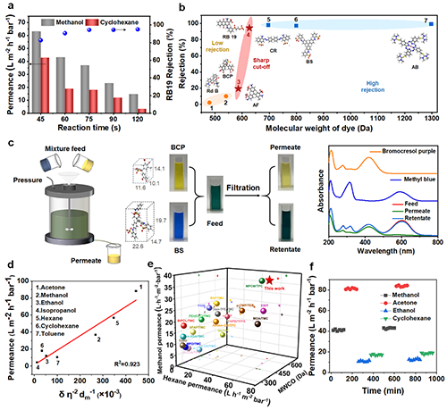ODA/TMC膜中的溶劑傳輸是一個(gè)復(fù)雜過程,通過串聯(lián)阻力模型理論模型和分子動(dòng)力學(xué)模擬進(jìn)行深入解析。利用Dagan模型分析發(fā)現(xiàn),對于此類超薄致密膜,雖然孔道內(nèi)部阻力占主導(dǎo),但入口阻力的影響不容忽視。Lucas-Washburn方程則揭示了正向的毛細(xì)管驅(qū)動(dòng)力可降低膜的溶劑分子入口阻力,提升傳輸效率。模擬結(jié)果顯示正己烷在膜中的傳輸速率快于甲醇,與實(shí)驗(yàn)測試結(jié)果一致。