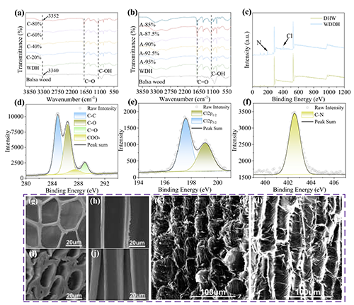 圖2通過FTIR、XPS、XRD和SEM等手段系統(tǒng)表征了WDDH的化學結(jié)構(gòu)與微觀形貌。FTIR顯示DAC引入后羥基峰發(fā)生紅移,表明分子間氫鍵增強;XPS證實了氯和氮元素的存在,說明DAC成功接枝;XRD顯示纖維素晶體結(jié)構(gòu)仍被保留,但結(jié)晶度略有下降,說明DAC的引入在一定程度上破壞了纖維素的規(guī)整排列。SEM圖像顯示水凝膠基質(zhì)充分填充木材細胞腔,界面結(jié)合緊密,無分層現(xiàn)象,表明木材骨架與水凝膠之間形成了強韌的復合結(jié)構(gòu)。