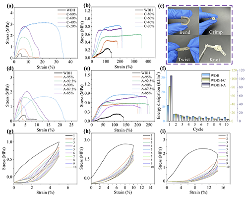 圖3 WDDH機械性能及在循環(huán)拉伸過程中能量損失與應力-應變行為