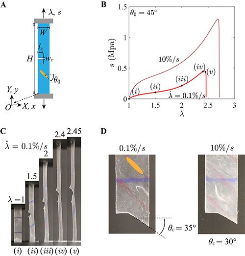 圖1:實驗中對具有傾斜初始液晶指向矢的LCE樣品進(jìn)行拉伸。圖中展示了應(yīng)力-應(yīng)變曲線,以及不同階段樣品中裂紋的實際傳播路徑。