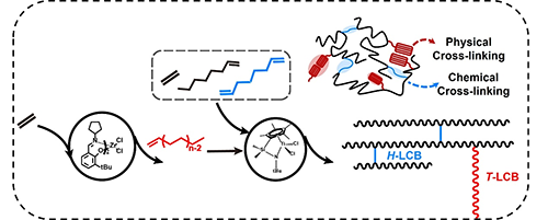 近期,浙江大學(xué)化學(xué)工程與生物工程學(xué)院王文俊教授團隊提出構(gòu)建帶兩種長支鏈結(jié)構(gòu)POE(DPOE)的新思路:在DPOE中同時引入T型(T-LCB)和H型(H-LCB)長支鏈。其中,T型長支鏈為結(jié)晶聚乙烯,可形成物理交聯(lián)點; H型長支鏈則由引入的二烯單體(1,7-辛二烯) 形成共價交聯(lián)點。兩類長支鏈協(xié)同作用,形成了“物理-化學(xué)”雙交聯(lián)網(wǎng)絡(luò),使DPOE在保持高強度和耐熱性的同時,具備更強的彈性恢復(fù)能力。