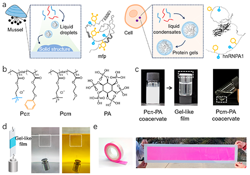 水下/油下黏附是海洋工程、生物醫學以及能源工業中的核心需求,但傳統膠粘劑在潮濕環境中極易失效。相比之下,自然界中的貽貝等生物卻能在水中穩固附著,其奧秘在于足絲蛋白序列中均勻分布的陽離子和芳香基團使其可以通過液-液相分離形成凝聚液滴,并進一步發生液-固轉變,構筑出具備強黏附性的聚合物網絡結構。