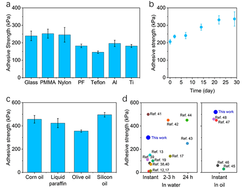 性能測試顯示,Pcπ?PA凝膠薄膜在水下玻璃基底上的黏附強度可達約300 kPa,并且對塑料、金屬等多種材料均表現出良好兼容性。更為突出的是,在油性環境中(如玉米油、硅油等),該材料的黏附強度最高可達500 kPa,優于目前報道的大多數同類體系。此外,這種膠膜還具有良好的可加工性,可制成膠帶、貼片等實用形態,展現出向臨床和工程應用轉化的巨大潛力。