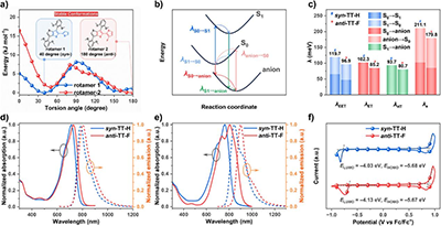 勢能面掃描證明旋轉異構體1采用順式構象(扭轉角40°),而旋轉異構體2采用反式構象(扭轉角接近180°)。同時DFT計算表明S???F非共價相互作用的S值為0.17,證實了骨架平面性的提高和順/反構象偏好的轉變可歸因于S???F非共價相互作用。進一步地通過重組能計算以及光譜學證明了anti-TT-F具有降低的重組能,更小的Stokes位移,以及顯著增強的分子剛性。