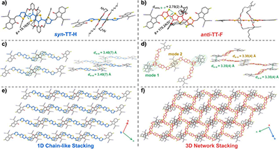 單晶X射線衍射分析結果表明:分子的構象偏好與勢能表面掃描結果一致,S???F非共價相互作用的引入引發了構象翻轉;具有順式構象的syn-TT-H形成了一維鏈狀堆積模式,而具有反式構象anti-TT-F則構成了三維網絡堆積模式,這有利于高效的電荷傳輸。