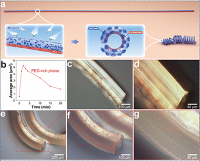 圖2. 濕氣驅(qū)動Janus纖維驅(qū)動器的作用機制與性能。a)濕氣驅(qū)動的變形機制示意圖;b)親水島相在濕氣刺激后的面積變化隨時間的演化;c–d)干燥狀態(tài)下親水性一側(cè)光滑的顯微鏡圖像;e–g)濕潤狀態(tài)下親水性表面的島相結(jié)構(gòu)溶脹導(dǎo)致表面粗糙的顯微鏡圖像。