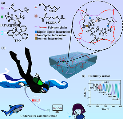 近日,廣西大學(xué)黃柏團(tuán)隊(duì)針對以上問題提出創(chuàng)新解決方案:開發(fā)了一種基于丙烯酰氧乙基三甲基銨雙(三氟甲磺酰)亞胺([ATAC][TFSI])PILEs合成新策略。引入兼容性丙烯酸酯單體,構(gòu)建了穩(wěn)定的剛?cè)岵?jì)交聯(lián)網(wǎng)絡(luò)。游離陰離子TFSI?在賦予體系電導(dǎo)率的同時,與聚陽離子主鏈形成動態(tài)可逆的靜電相互作用,從而實(shí)現(xiàn)高效均勻的能量耗散。材料內(nèi)部強(qiáng)化的疏水相互作用,進(jìn)一步賦予其優(yōu)異的抗環(huán)境干擾能力,有效屏蔽了溫度與水分子對材料性能的不利影響,從而實(shí)現(xiàn)了離子導(dǎo)電彈性體在多場景的傳感應(yīng)用。