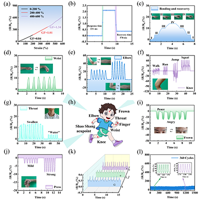 基于寬范圍(0-600%應(yīng)變)、高靈敏(GF最高1.34)、快速響應(yīng)(331 ms)及出色的耐用性等特性,AT-80%可穿戴應(yīng)變傳感器可監(jiān)測區(qū)分人體關(guān)節(jié)運(yùn)動模式,甚至靈敏捕捉吞咽、皺眉等細(xì)微生理變化,在情緒識別與手寫軌跡追蹤中也具備應(yīng)用潛力。