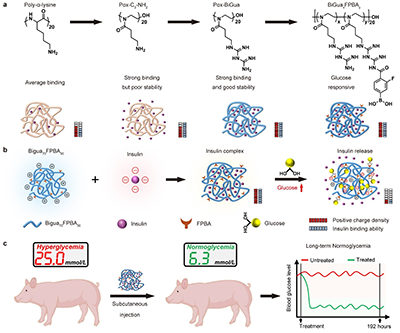 劉潤輝教授課題組在前期研究中,提出了以優異生物安全性的聚噁唑啉模擬天然多肽,創新性地實現了基于聚噁唑啉骨架的功能性多肽模擬,發現了具有多種生物活性的聚噁唑啉活性分子(Angew. Chem. Int. Ed. 2020, 59, 6412,VIP論文,ESI高被引;Angew. Chem. Int. Ed. 2022, 61, e202200778,VIP論文;J. Am. Chem. Soc. 2023, 145, 25753,JACS Spotlight)。本研究進一步提出設計兼具良好生物相容性和與胰島素形成強靜電相互作用正電荷聚噁唑啉聚合物用于制備超長效葡萄糖響應性胰島素制劑的新策略。在聚合物中引入雙胍基團取代伯胺基與胰島素通過靜電作用形成復合物,通過氫鍵和鹽橋雙重作用與胰島素形成更強相互作用,獲得更高和更穩定的胰島素負載能力(圖1),進一步在聚合物側鏈修飾4-羧基-3-氟苯硼酸(FPBA)實現葡萄糖響應性胰島素釋放。在1型糖尿病動物模型中,單次皮下注射可維持糖尿病豬正常血糖超過192小時,且極少出現高血糖和低血糖事件(圖1)。本研究為超長效葡萄糖響應性胰島素制劑的開發和臨床糖尿病人血糖管理提供了一種極具潛力的選擇。