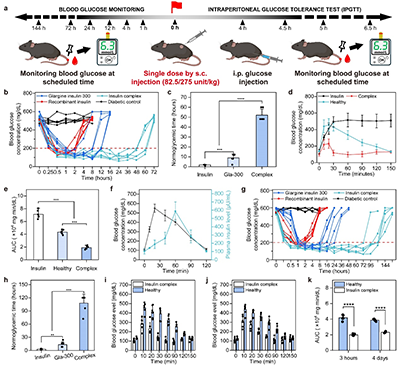 胰島素復合物在鏈脲佐菌素(STZ)誘導的1型糖尿病小鼠模型中表現出出色的治療效果。實驗結果表明等效胰島素劑量為82.5 U/kg胰島素復合物可維持糖尿病小鼠正常血糖超過48小時,顯著長于同等劑量下的天然胰島素(約2小時)和長效胰島素甘精胰島素Gla-300(9小時)(圖6b)。復合物治療組中40%的小鼠在治療后60小時仍保持正常血糖,且所有小鼠血糖值均低于初始水平,表明復合物在60小時后仍持續有效(圖6b, c)。腹腔葡萄糖耐量試驗(IPGTT)結果表明,復合物治療組的血糖在30分鐘內恢復至正常水平,快于健康對照組120分鐘的恢復速度(圖6d, e),血糖顯著升高的同時伴隨血漿胰島素的快速上升(圖6f)。等效大劑量治療實驗結果表明,胰島素復合物能將血糖維持在正常范圍內超過120小時(圖6g, h),且未發生低血糖事件。約50%的復合物治療組小鼠在給藥144小時后血糖仍低于初始水平,表明復合物的有效性可持續超過6天(圖6g)。在治療后3小時和4天進行的IPGTT實驗結果表明,復合物能迅速將峰值血糖調節至正常水平,其趨勢與健康小鼠一致(圖6i至6k)。