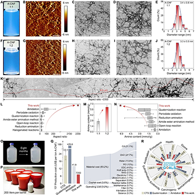 近期,東北林業(yè)大學(xué)于海鵬教授團(tuán)隊(duì)聯(lián)合美國(guó)德克薩斯大學(xué)奧斯汀分校余桂華教授,在前期實(shí)現(xiàn)羧基化纖維素納米纖維低成本、規(guī)模化、可持續(xù)制備的基礎(chǔ)上(Nat. Sustain. 7, 315–325 (2024)),開(kāi)發(fā)出一種綠色、經(jīng)濟(jì)且可擴(kuò)展的新方法,可將可持續(xù)纖維素高效轉(zhuǎn)化為高長(zhǎng)徑比(~2200)、高氨基含量(6.5 mmol/g)與高收率(96.9%)的A-CNF。生命周期評(píng)估與技術(shù)經(jīng)濟(jì)分析共同表明,該合成路線兼具綠色性與可擴(kuò)展?jié)摿Α?/span>