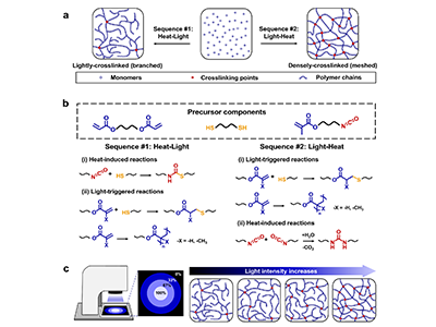 在該研究中,光照與加熱作為兩種正交的聚合反應,通過不同的引發順序造成LCE網絡的拓撲結構差異。如圖1所示,LCE單體體系包含了(甲基)丙烯酸酯基、巰基與異氰酸酯基。由于巰基是光照反應與加熱反應的共同反應物,前序反應中巰基的消耗會影響參與后序反應的基團配比,從而造成了先加熱后光照(Heat-Light)與先光照后加熱(Light-Heat)這兩種順序的反應結果差異。其結果導致Heat-Light順序產生輕度交聯的網絡,而Light-Heat順序產生密集交聯的網絡。