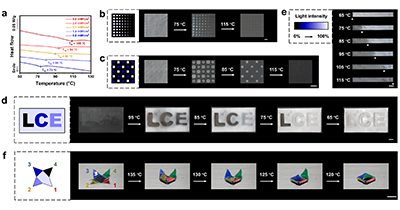 研究團隊注意到,在Light-Heat順序中控制前序光照的強度和時間,可以使得所得到的聚合物性能處于Heat-Light與Light-Heat之間的過渡態。如圖4所示,通過調節前序光照的強度,可以得到相轉變溫度處于中間態的LCE材料。進一步地,將具有特定空間強度分布的圖案化數字光用于前序光照,可以得到帶有相轉變溫度異質性的多材料LCE,甚至可以實現相轉變溫度沿特定方向的梯度變化。除圖案化外,如此帶有過渡態相轉變溫度的多材料LCE還可以實現冷卻過程中的按序折疊變形。