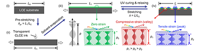 通過對LCE基底施加雙向預拉伸,可進一步拓展至二維紋理與顏色的調控(圖6A)。研究比較了按序釋放應力和同時釋放應力兩種模式:按序釋放應力時,表面先形成一維褶皺,之后演化為規則的之字形圖案(圖6B);而同時釋放則產生無序的迷宮狀紋理。這種雙向拉伸策略為實現復雜的二維光學圖案提供了更多設計自由度。