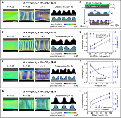 系統研究了CLCE層厚度(Hf)、基底預拉伸比(λpr)和雙層模量比(Ef/Es)對表面褶皺形貌與結構色的影響。結果表明,增大CLCE層厚度可在保持顏色分布不變的情況下線性增大褶皺波長和振幅(圖2A,C,D);提高預拉伸比可形成更密集、振幅更大的褶皺結構(圖2A,E,F);而改變雙層模量比不僅會改變褶皺波長和振幅,還可形成不同的表面紋理,并伴隨不同的顏色響應(圖2A,G,H)。有限元模擬與實驗結果高度吻合,準確預測了應變分布與顏色變化。