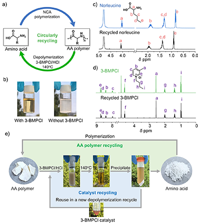 聚合物的高效降解及回收利用是推動循環聚合物經濟發展的關鍵。3-BMPCl可高效催化氨基酸聚合物降解,生成環境友好的氨基酸原料。以聚正亮氨酸作為模型聚合物,在140℃及鹽酸存在條件下,3-BMPCl可在8小時內催化其高效降解為正亮氨酸。相比之下,無催化劑參與的對照實驗幾乎沒有降解,充分體現了3-BMPCl在氨基酸聚合物解聚過程中的關鍵催化作用。值得注意的是,該解聚與回收策略成功實現了氨基酸原料和3-BMPCl催化劑的雙重閉環回收:通過簡單沉淀操作,就可實現水解產物正亮氨酸85.9%的回收率,且3-BMPCl催化劑經減壓濃縮后也可實現等量回收(圖7)。陽離子催化的聚合物降解策略符合循環經濟原則,為氨基酸聚合物及相關工程塑料的綠色循環處理提供了具有廣闊前景的技術路徑。