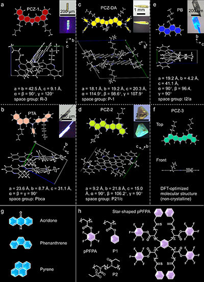 圖3。熒光團和聚合物的化學結構。(a) PCZ-1、(b) PTA、(c) PCZ-DA、(d) PCZ-2、(e) PB的單晶結構。(f) PCZ-3的dft優化結構。(g)用于對照實驗的傳統熒光團,包括吖啶酮、菲和芘。(h)聚合物結構示意圖。