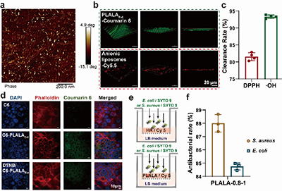 圖2. (a)PLALAExt的原子力顯微鏡形貌表征;(b)C6標記的PLALAExt與Cy5.5標記陰離子脂質體在模擬腸黏液層中滲透行為的三維共聚焦顯微圖像對比;(c)PLALA-0.8-1對DPPH及·OH自由基的清除效率;(d)PLALAExt細胞攝取機制研究;(e)基于Transwell模型的PLALA物理屏障功能示意圖;(f)PLALA-0.8-1對大腸桿菌與金黃色葡萄球菌的抑制效果測定