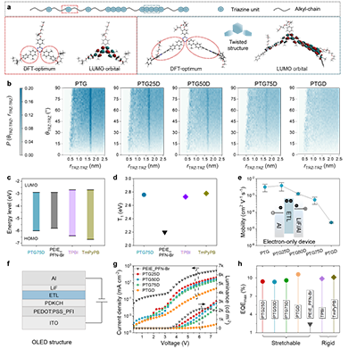 可拉伸OLED作為柔性顯示與電子皮膚的關鍵技術,其性能長期受限于缺乏高效的電子注入路徑。傳統小分子電子傳輸材料和低功函金屬陰極雖能實現高效率,但不具備本征可拉伸性;而現有可拉伸導體(如銀納米線、PEDOT:PSS等)往往功函過高,難以有效注入電子,且易導致激子淬滅。為解決這一矛盾,研究團隊首先設計并合成了一系列基于三嗪單元與柔性烷基鏈交替共聚的離散型聚合物電子傳輸層(PTG系列)。該類材料不僅具有合適的LUMO能級(~ ?3.2 eV)和高電子遷移率,其主鏈扭曲結構還賦予其高達2.76 eV的三重態能級(T?),顯著高于傳統PFN-Br(< 2.4 eV),從而有效抑制激子非輻射損失。其中,PTG75D在保持>100%斷裂應變的同時,使OLED外量子效率(EQE)提升至9–10%,是PFN-Br體系的4倍以上(圖1, 圖2,圖3)。