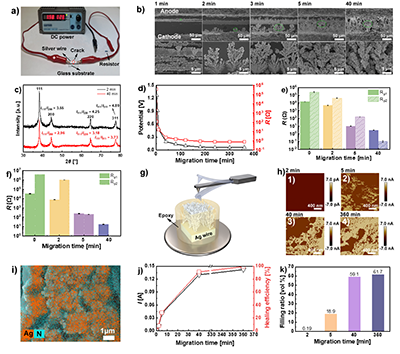 圖4. 銀線路導電自修復性能。修復條件:裂紋寬度 = 100 μm,KNO3濃度 = 1.6 wt%,銀線路與凝膠電解質接觸面積 = 0.035 mm2。(a) 模擬銀電路修復示意圖。(b) 銀遷移產物在不同遷移時間下的形貌(下排圖像是上排圖像中綠色圈出區域的放大圖)。(c) 不同遷移時間下銀遷移產物的XRD譜圖。(d) 不同遷移時間下裂紋間的電阻和電壓。(e, f)銀遷移過程中,與(e)陽極、(f)陰極連接的銀線路與膠體電解質之間的電化學反應極化電阻。(g) AFM的測試示意圖和(h) 不同遷移時間下Ag遷移產物沿生長方向橫截面的AFM電流分布圖。(i) 遷移時間為360 min時Ag和N元素在銀遷移產物截面上的分布情況。(j) 電流和自修復效率與遷移時間的關系。(k) 不同遷移時間下遷移產物中銀枝晶的體積填充率。