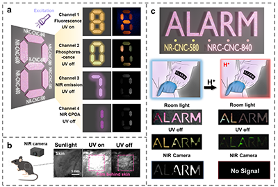基于以上材料近紅外區(qū)響應(yīng)、圓偏振發(fā)光、長壽命、高不對稱、可動態(tài)響應(yīng)等諸多優(yōu)點(diǎn),該材料體系展示出在多通道信息加密、防偽標(biāo)識等方面的潛力;同時(shí),近紅外長余輝的低噪音背景優(yōu)勢也使其有望拓展至生物成像與化學(xué)/環(huán)境傳感等應(yīng)用場景。