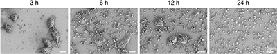 圖3. 4T1細胞經EG45-D-K-D-pYA處理后,分別于3、6、12及24 h拍攝的掃描電子顯微鏡(SEM)圖像顯示了微泡(MV)隨時間的形成過程。