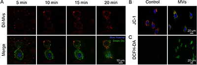 圖4. 微泡形成過程的動態檢測及組分分析。(A)DiI標記的微泡(紅色)與DiO標記的4T1細胞(綠色)共孵育后,在5、10、15和20 min時間點拍攝的時間序列共聚焦激光掃描顯微鏡(CLSM)圖像,展示了二者間的動態相互作用過程。細胞核經Hoechst染色(藍色)。(B,C)經微泡處理的4T1細胞CLSM成像顯示:JC-1染色中,紅色熒光代表線粒體膜電位較高的JC-1聚集體,綠色熒光代表膜電位降低的JC-1單體,表明線粒體膜電位發生改變;DCFH-DA染色顯示細胞內ROS水平升高。