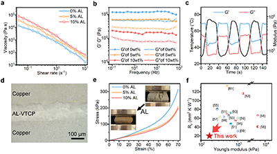 流變測試表明,添加木質(zhì)素后,材料粘彈性顯著提升,呈現(xiàn)出更優(yōu)異的凝膠行為,且更容易變形。這種增強的柔韌性使其能緊密貼合粗糙表面,有效填充縫隙。對比數(shù)據(jù)顯示,AL-VTCP擁有極低的壓縮模量(170 kPa)和接觸熱阻(20.0 mm2 K W?1),遠超多數(shù)報道的熱界面材料,完美解決了高導熱與軟貼合之間的固有矛盾(圖3)。