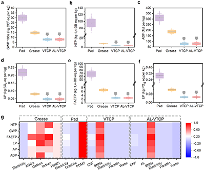 從原料到成品的生命周期評估表明,AL-VTCP及其前驅(qū)體VTCP在多項環(huán)境指標(如全球變暖潛力、人體毒性潛力等)上均顯著低于傳統(tǒng)以PDMS為基的商用導熱產(chǎn)品,展現(xiàn)出優(yōu)異的環(huán)保特性。這主要歸功于其以生物質(zhì)(木質(zhì)素、纖維素)和水為基礎的材料設計,為發(fā)展高性能且可持續(xù)的電子散熱材料提供了新范式(圖8)。