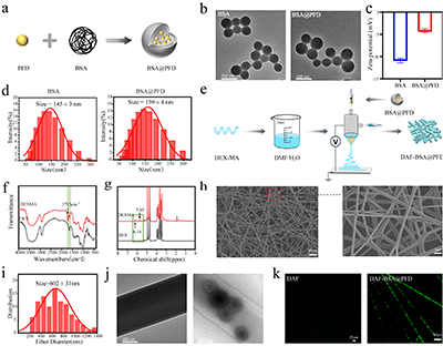 該研究以具有良好生物相容性與可修飾性的甲基丙烯酰化硫酸軟骨素(CA)作為水凝膠基質,同時通過同軸靜電紡絲技術制備了以甲基丙烯酰化葡聚糖為殼層、包載吡非尼酮白蛋白納米顆粒(BSA@PFD)為核的納米纖維網絡。掃描電鏡與透射電鏡表征結果表明,所得納米纖維具有清晰的核殼形貌、均一的直徑尺寸,且載藥納米顆粒在纖維芯層內部分布均勻(圖2),為藥物的可控釋放奠定了結構基礎。