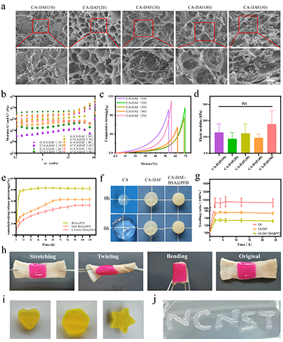 近期,燕山大學環境與化學工程學院張強團隊通過模擬皮膚筋膜層的多級次纖維網絡結構,制備出基于核殼納米纖維的復合水凝膠材料(CA-DAF-BSA@PFD),為實現慢性傷口的高質量愈合提供了新思路(圖1)。