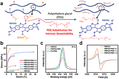 圖1 a) 聚乙二醇(PEG)替代溶劑對PBFDO進行塑化的示意圖。b) 不同PEG固含量下自支撐PBFDO-PEG薄膜的應力-應變曲線。c) PBFDO薄膜、PBFDO-PEG薄膜及FA-PEG薄膜的XPS(O 1s)光譜。d) PBFDO薄膜及不同PEG固含量的PBFDO-PEG薄膜的EPR譜圖。