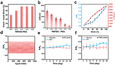圖2 PBFDO- PEG復合薄膜的力電性能表征。a) 不同PEG固含量下PBFDO-PEG薄膜裂紋起始應變的變化。b) 不同PEG固含量下PBFDO-PEG薄膜的電導率。c) 拉伸過程中PBFDO-PEG薄膜的電阻與電導率變化。d) PBFDO-PEG薄膜在100%應變下經1000次循環的電阻變化;以及在不同儲存條件下e) 0%應變和f) 100%應變狀態下,經15天儲存后薄膜的電阻變化。