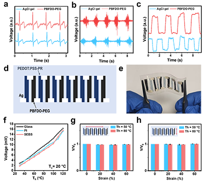 圖4. PBFDO-PEG材料在電生理信號記錄與熱電設備中的應用。a) 心電圖信號,b) 表面肌電圖信號,c) 眼電圖信號;分別由Ag/AgCl凝膠電極與PBFDO-PEG電極測量所得。d) 全印刷熱電設備結構示意圖。e) SEBS基底上的全印刷熱電設備。f) 不同基底上全印刷熱電裝置的輸出電壓。沿裝置縱向(g)和橫向(h)方向的單軸拉伸測試,在冷源溫度(Tc)為20℃及熱源溫度(Th)分別為50℃和80℃時熱電裝置輸出電壓的變化。V/V?為不同應變速率下輸出電壓(V)與初始輸出電壓(V?)之比。